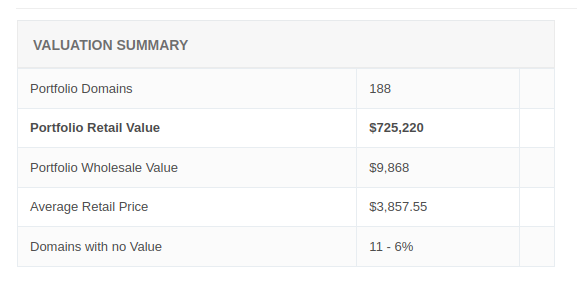 About US$725,000.00 value of domains I seek to borrow against to fund more domain purchases this year. Valuations bought on EstiBot.com that is approved by IRS for domain valuation purposes. Paid about $10k.